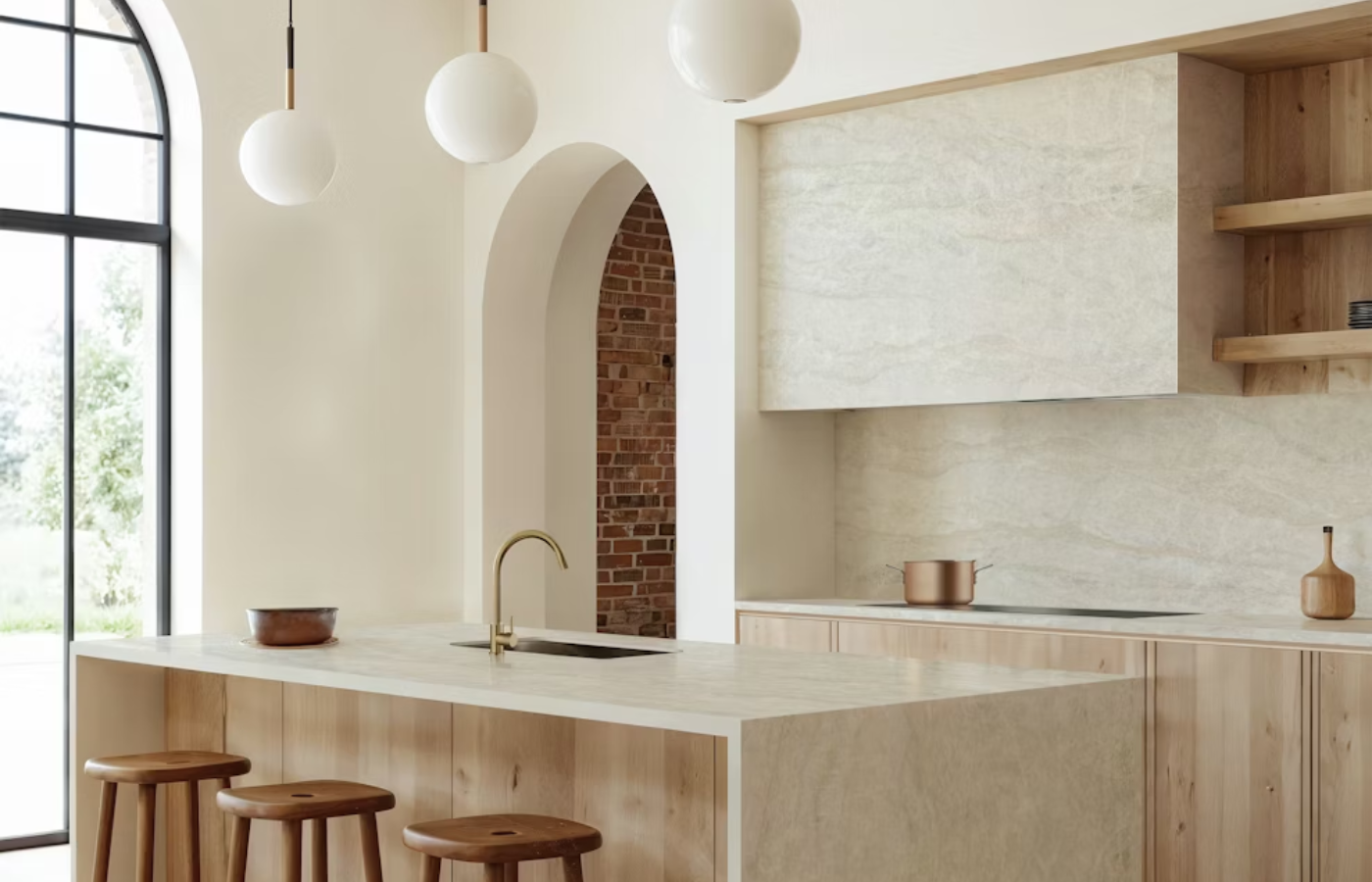 Soft Stone Countertops – Light quartz, marble, and quartzite create a calm, natural appearance that complements wood tones.